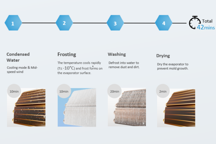Midea Inverter AC has been upgraded from water washing (20 mins) to frost cleaning (42 mins), which can remove more dust and bacteria, keeping the AC clean and performing well.